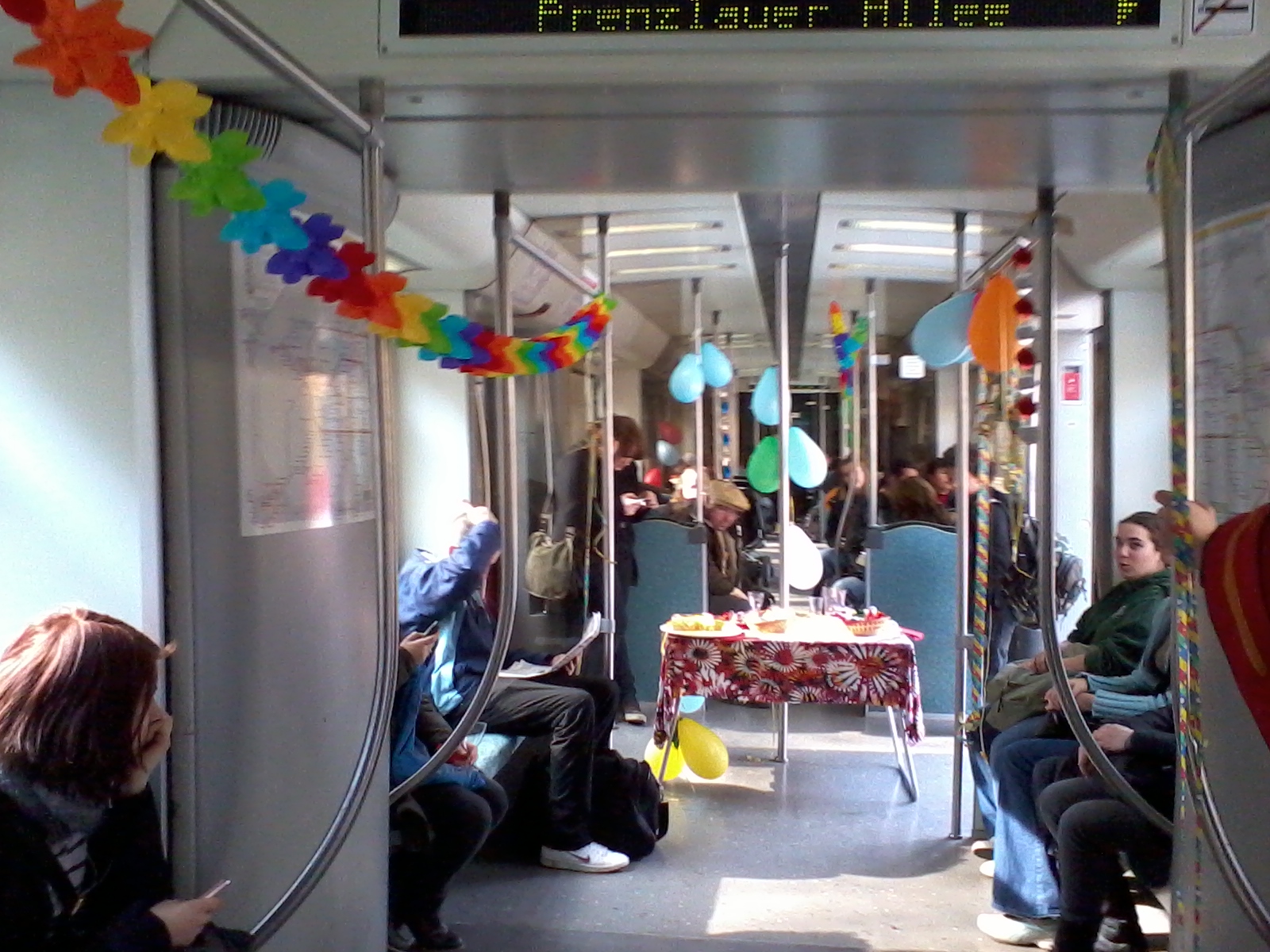 This is a bloody brilliant place. The thought occurs to me from time to time just as I’m walking along the street or waiting on a train platform. But Berlin has a great way of simply giving you things to be grateful for, shoving them in front of you so abruptly and with so little warning that you almost trip over them. Thus it was that when I got onto the Ring-Bahn on Wednesday to get home from Schönhauser Allee I found that the one carriage I had got into had been decorated with wild and colourful party decorations. Noticing that people were giving me funny looks over my shoulder, I turned around to see that right in the centre of the aisle the same people had arranged a picnic table displaying a homemade orange-drizzle cake, baskets of sweets and chocolates each individually hand-wrapped into take-home packets, another basket filled with little bottles of champagne and an array of champagne glasses so you could properly toast whatever you felt appropriate. Next to all of this was a disposable camera with ‘Please use!!’ written on in German. The men on the carriage all took cake; the women all shyly came and rifled through the baskets as if out of pure scientific interest before giving up the pretence and taking a handful of chocolates; the kids on the train all yelled ‘Geil!!’ and grabbed things in fistfuls. I don’t think I have ever felt such gooey-happy energy bubbling frothing around a train carriage before and I don’t suppose I will again. No-one knew who had done it or why, but for whatever reason it had happened and it wasn’t even that surprising because in this city weird and entertaining things happen on a near-daily basis.