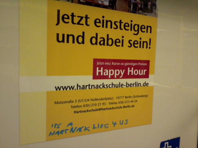 Look at this graffiti. Isn’t it fantastic? Hilarious, pun-tacular and inexplicably written in powder blue liquid chalk. That’s what I love about this place: every day I find at least one little thing that makes me grin stupidly in public, usually in front of a mass of people failing to see the humour in a small dog carrying a Brötchen or a man accidentally throwing his phone onto the train tracks immediately before the arrival of the S-Bahn. Odd considering this is a nation that invented the word ‘Schadenfreude’.