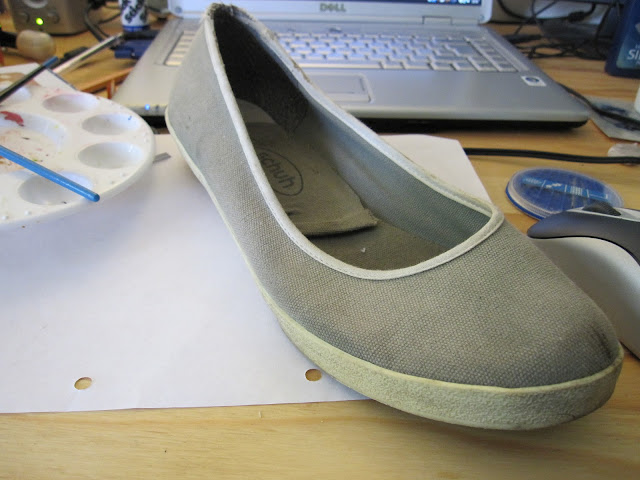 Hoo-wee! After hours and hours scratching away at my Wacom tablet, the illustrations are now finished and ready to teach whole cohorts of babies in Berlin. I can leave the desk and the hours of having Cookery School on in the background to keep me sane (it’s a new discovery, a brilliant cooking programme containing all my favourite things: absolutely droolworthy recipes, idiot people getting their cooking wrong, the girl-we-all-love-to-hate Gizzi Erskine and a professional chef who sounds exactly like Dylan Moran, meaning that when I’m not looking at the video I can pretend I’m listening to Bernard from Black Books yelling about coulis). Now that this is all over, I can begin the part of my holiday I have been dearly looking forward to: proper crafting. These grimy, stained grey shoes are terrible and I was going to have to throw them away because it would have been antisocial to wear them in public any more. But good god, are they comfy. And they match everything and make my feet look not enormous, which they in fact are. So I decided to ‘upcycle’ them and give them a new lease of life, using nice densely pigmented acrylics mixed with a fabric medium to make a varied grey leaf pattern on the canvas upper and painting over the now-brown once-white binding trimming the top. Scrubbed the soles with a bit of Jif to whiten them up a little and call me crazy, but I suspect they might just be wearable now. What could be better and more fun than rescuing an old possession and at the same time getting something new and different out of it?